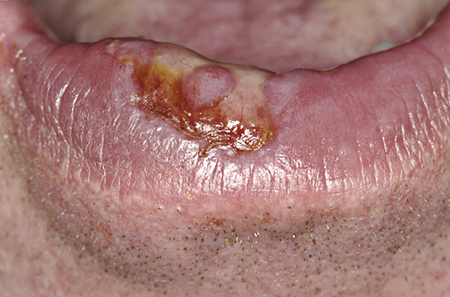 Figur 5. Primärt/sekundärt syfilissår, underläpp.
