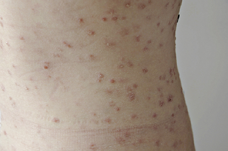 Figur 6. Sekundär syfilis med fjällande makulopapulösa hudförändringar, bål.