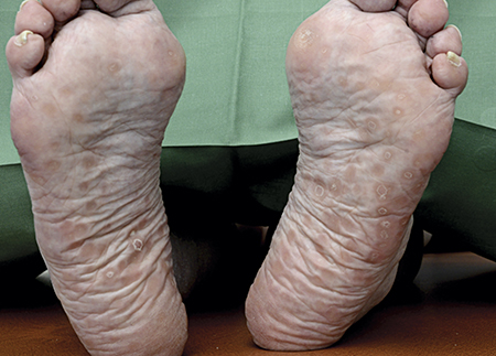 Figur 8. Sekundär syfilis med klassiska roseoler, fotsulor.