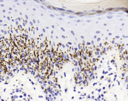 PAD visade diskret interfasdermatit och cellfattiga inflammatoriska infiltrat med enstaka plasmaceller; immunhistokemisk analys med spiroketantikropp var positiv. Det sparsamma infiltratet berodde troligen på den immunsupprimerande prednisolonbehandlingen. Serologiska test för syfilis visade i april TPPA > 40 960/VDRL 256 och efter behandling TPPA > 160 (inte titrerat)/VDRL 4.