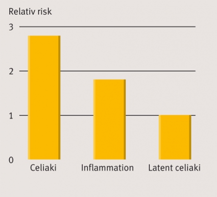 Vi fann ökad risk för lymfom vid både celiaki (hazard-kvot, HR, 2,82; 95 procents konfidensintervall, CI, 2,36–3,37; P < 0,001) och inflammation utan villusatrofi (HR 1,81; 95 procents CI 1,42–2,31; P <0,001) men inte vid latent celiaki (HR 0,97; 95 procents CI 0,44–2,14; P = 0,95). Jämfört med celiaki innebar såväl inflammation utan villusatrofi som latent celiaki en statistiskt säkerställd lägre risk. Risken för solida tumörer var inte ökad för någon av grupperna efter ett års uppföljning. Vid celiaki var även risken för Hodgkins lymfom ökad, likaså risken för non-Hodgkins lymfom av både T-cells- och B-cellstyp. Studien visade att patienter med diagnostiserad celiaki har en lägre ökning av risken för lymfom än de flesta tidigare studier visat samt att riskökningen kvarstod även efter mer än fem års uppföljning. Detta stod i kontrast till den allmänna cancerrisken, som var förhöjd enbart första året efter studiestart. Lymfomrisken påverkades av graden av slemhinneskada, och det går inte att bedöma risken för framtida lymfom vid celiaki med hjälp av enbart celiakiserologi.