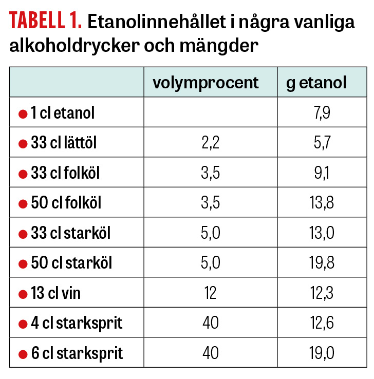 Som en del i Socialstyrelsens »Nationella riktlinjer för prevention och behandling vid ohälsosamma levnadsvanor« ändrades nyligen gränsvärdet för vad som anses vara ett riskbruk av alkohol [5]. Det rekommenderade gränsvärdet är numera lika för alla, oavsett kön och kroppsvikt, och definieras som intag av 10 »standardglas« eller mer per vecka, eller 4 standardglas eller mer vid ett och samma tillfälle (»intensivkonsumtion«) 1 gång i månaden eller oftare. Definitionen av ett standardglas skiljer sig åt mellan olika länder, från 8–20 gram etanol, men i Sverige används 12 gram, vilket ungefär motsvarar innehållet i 50 cl folköl (3,5 volymprocent), 33 cl starköl (5 volymprocent), 12 cl lättvin (13 volymprocent) eller 4 cl starksprit (40 volymprocent) (Tabell 1). I syfte att bryta ohälsosamma alkoholvanor innehåller riktlinjerna även en rekommendation till hälso- och sjukvården att erbjuda rådgivande samtal och stöd till vuxna som har ett riskbruk, inför operation på grund av den ökade komplikationsrisken [6] samt till unga under 18 år och gravida som dricker alkohol men som bör avstå helt.