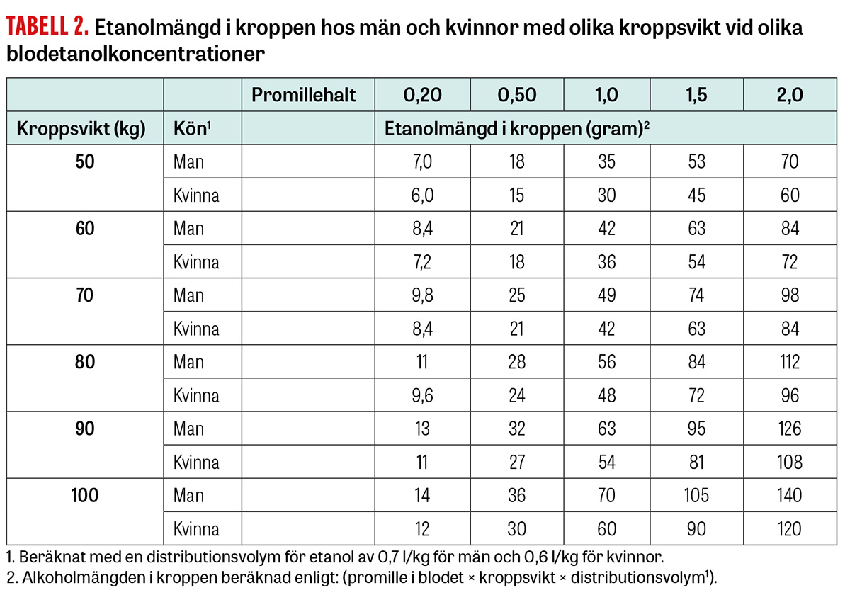 En faktor med stor inverkan på promillehalten är kroppsvikten och kroppsmasseindex (BMI), som har betydelse för den vätskevolym i kroppen som etanolen kan fördelas i (distributionsvolymen) [14]. Följaktligen kan en stor och tung person dricka mycket mer alkohol än den som är liten och lätt men ändå få samma promillehalt i blodet (Tabell 2).