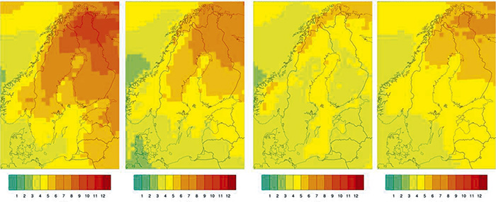Figur 2. Beräknad förändring av de olika årstidernas medeltemperatur för perioden 2071–2100 jämfört med 1971–2000. Från vänster: vinter, vår, sommar, höst. Kartorna baseras på ett medelvärde av en ensemble med nio klimatscenarier för scenario RCP 8.5. Från SMHI [6].
