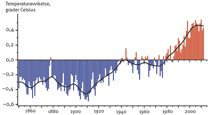 Figur 1. Tidsserien visar den sammanlagda globala land- och havsytetemperaturen uppmätt 1850–2012 i förhållande till medeltemperaturen under perioden 1961–1990. Från: Morice et al [1].