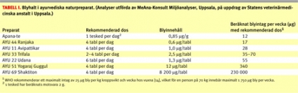En litteratursökning visade flera tidigare fall av blyförgiftning orsakad av ayurvediska preparat [1-4], men inga tidigare fall från Sverige. Ett urval av de ayurvediska preparaten skickades för analys av blyinnehåll. Ett av preparaten, AYU 69 Shaktiton, hade en mycket hög blyhalt, motsvarande 8,2 mg bly per tablett (Tabell I).