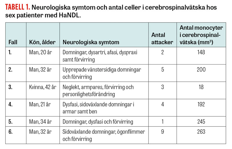 HaNDL (syndrome of transient headache and neurologic deficits with cerebrospinal fluid lymphocytosis) är ett ovanligt syndrom med övergående huvudvärk associerat med neurologiska bortfallssymtom samt lymfocytos i cerebrospinalvätskan. Tillståndet har även kallats för pseudomigrän med övergående neurologiska symtom och lymfocytär pleocytos [1]. Som namnet antyder så kännetecknas HaNDL av en eller flera episoder av huvudvärk, övergående neurologiska bortfallssymtom såsom exempelvis afasi, hemipares, konfusion samt lymfocytär pleocytos i cerebrospinalvätskan. Med artikeln vill vi uppmärksamma syndromet, underlätta korrekt diagnos och undvika onödig behandling. Här presenterar vi sex patienter med misstänkt HaNDL på vår klinik från de senaste åren (se Tabell 1), varav fyra patienter presenteras mer i detalj nedan.