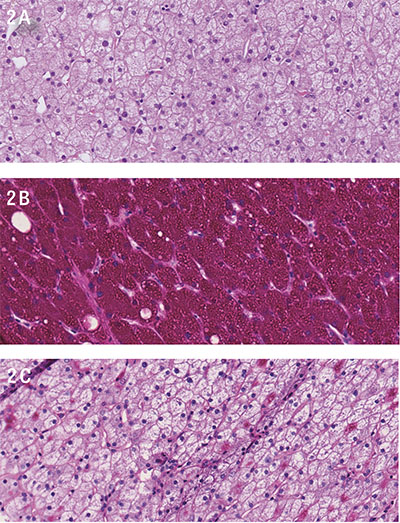 Figur 2. Massiv inlagring av glykogen i levern. A: hematoxylin–eosinfärgning, B: perjodsyra–Schiff (PAS)-färgning för glykogen, C: PAS–diastasfärgning (PAS-D). 20 gångers förstoring i samtliga delfigurer.