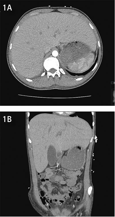 Figur 1. Uttalad hepatomegali hos patienten. Datortomografisk bild (A: axialt, B: sagittalt) som visar kraftigt för-