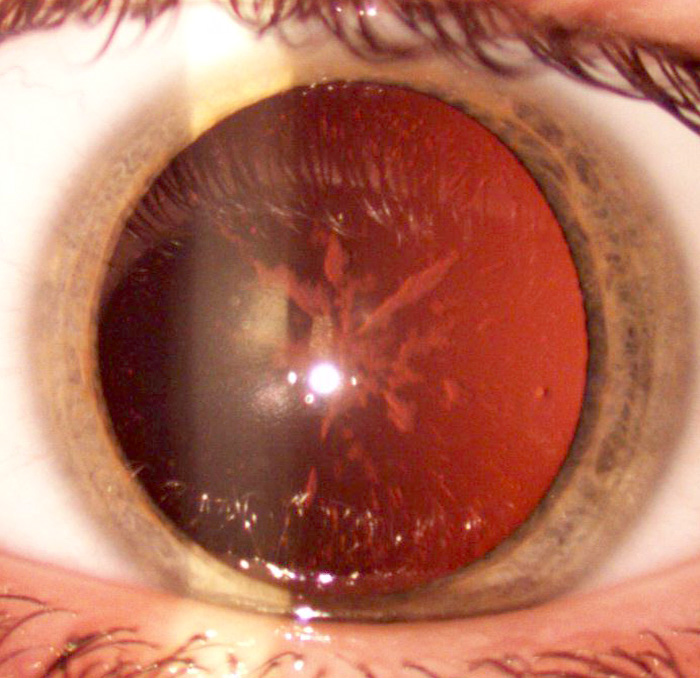 funktionellt och medför inga beskrivna organskador. Undantaget är ögonens linser. Här sker en gradvis inlagring av ferritinkomplex, som ger katarakt. Katarakten beskrivs som central, ofta med radierande starrekrar (Figur 1). Mindre infiltrat ses också perifert i linsen, och vid progress fylls det mellanperifera området ut. Vid mikroskopisk undersökning ses små vita »brödsmuleliknande« infiltrat som kan konfluera till större kristalliknande utfällningar. Ibland kan man också se små vakuoler. S-ferritinnivån verkar inte korrelera med graden av katarakt. Katarakten ger oftast symtom före 30-årsåldern, i många fall redan före 10 års ålder.