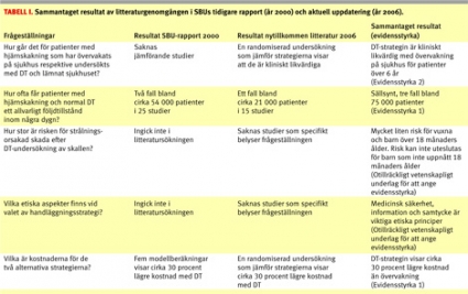 År 2000 utgavs SBU-rapporten »Hjärnskakning – övervakning på sjukhus eller datortomografi och hemgång?«. Utvärderingen visade att onormala fynd vid DT påvisas hos omkring 9 procent av patienter med hjärnskakning som sjukhusvårdas och att i genomsnitt 1 procent av patienterna behöver neurokirurgisk åtgärd. SBUs projektgrupp konstaterade också att det är mycket sällsynt att en patient försämras inom några dygn efter DT med normala fynd. Emellertid gick det inte att fastslå om det finns några skillnader i medicinskt resultat mellan DT och hemgång och övervakning på sjukhus, eftersom det saknades studier som direkt jämförde dessa två strategier.