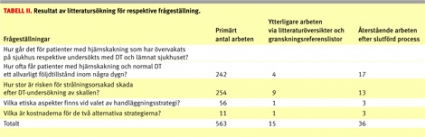 Denna rapport granskar det vetenskapliga underlaget för två strategier för akut omhändertagande av hjärnskakning: DT och hemgång respektive övervakning på sjukhus. För de två första frågeställningarna har litteratursökning gjorts i olika databaser för åren 2000–2006. För övriga frågeställningar har sökningarna omfattat åren 1966–2006. Tabell I visar det sammantagna resultatet av litteraturgenomgången i SBUs tidigare rapport (år 2000) och aktuell uppdatering (år 2006).