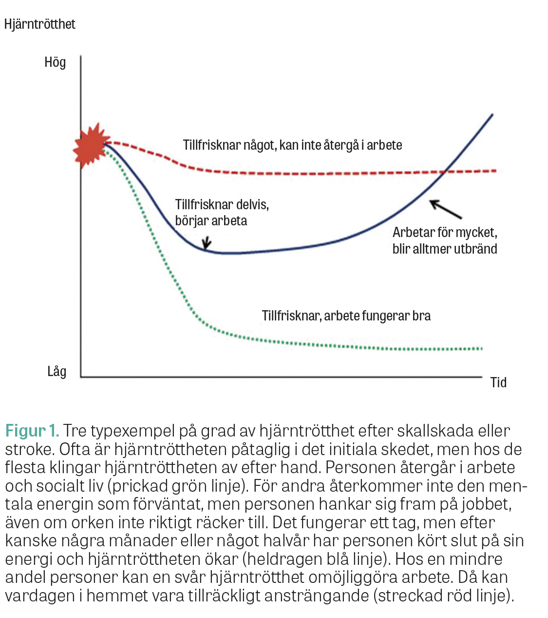 Hjärntrötthet är vanlig vid sjukdom eller skada i nervsystemet (Fakta 2). Hos de flesta lindras eller upphör hjärntröttheten när skadan eller sjukdomen läker, men för en mindre andel blir hjärntröttheten kvar under månader eller till och med flera år [1, 3-6] (Figur 1). Hos personer med cerebral pares kan hjärntrötthet förekomma, liksom vid neuropsykiatriska tillstånd [7, 8]. Hjärntrötthet är inte relaterad till skadans/sjukdomens svårighetsgrad. Även en lindrig hjärnskakning kan ge svåra och långvariga konsekvenser [9, 10].
