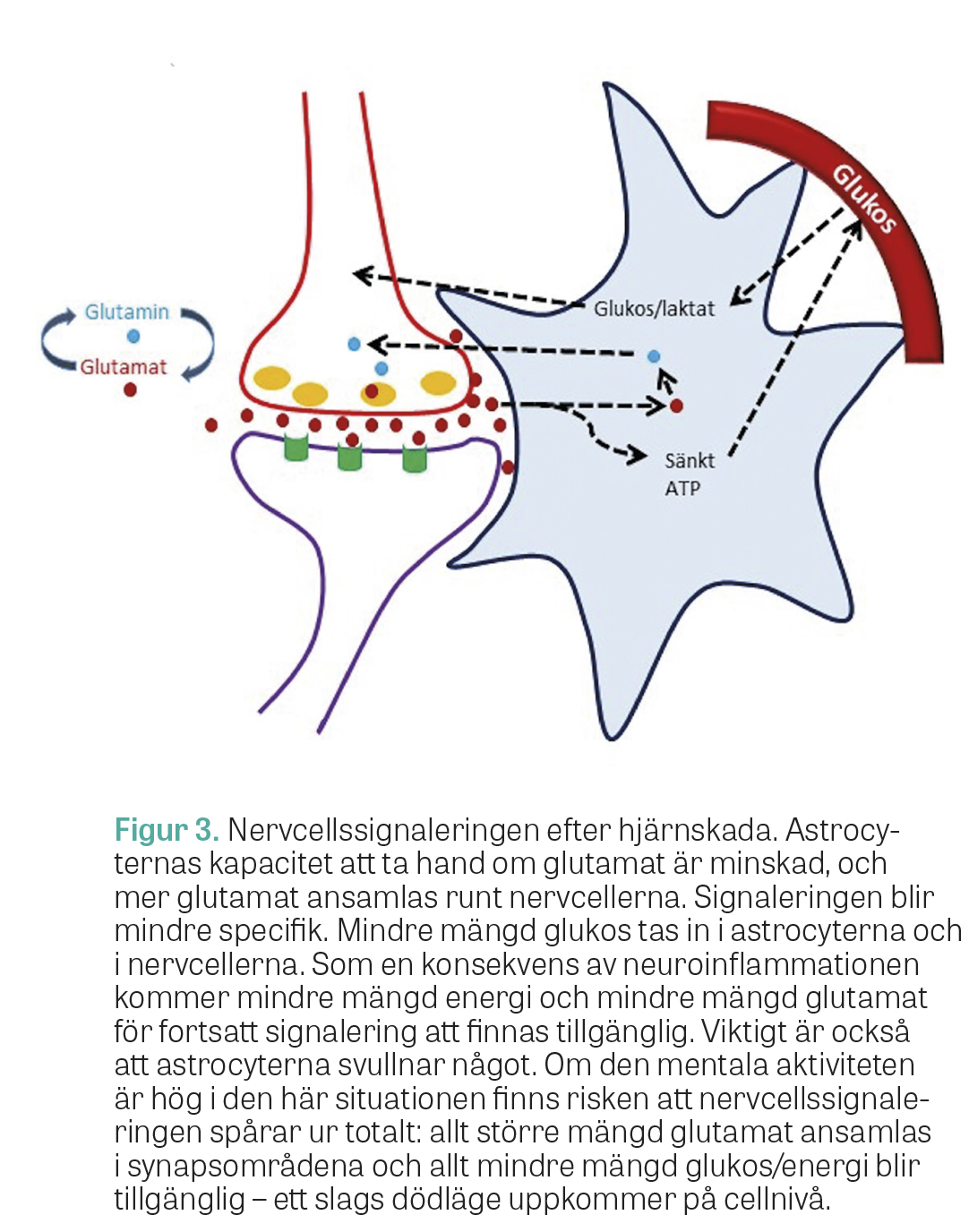 Skada eller sjukdom i nervsystemet ger upphov till neuroinflammation, vilket kan påverka astrocyternas glutamatupptagningsförmåga negativt [27]. Resultaten blir att glutamathalten i utrymmet mellan cellerna ökar något, dels på grund av astrocyternas minskade kapacitet att ta hand om glutamat, dels på grund av cellsvullnad. Detta leder till ospecifik aktivering av nervcellerna och ökat brus i nervcellssignaleringen. Det minskade glutamatupptaget är också kopplat till lägre glukosupptag i astrocyterna, vilket kan bidra till sämre energiförsörjning. Sammantaget försvåras signaleringen mellan astrocyterna, vilket kan minska deras kapacitet att ta hand om och transportera glutamat inom astrocytnätverken. Djurexperiment har visat att även dopaminsignaleringen minskar vid neuroinflammation [28]. Resultatet av ovanstående mekanismer blir negativa effekter för nervcellstrafiken (Figur 3).
