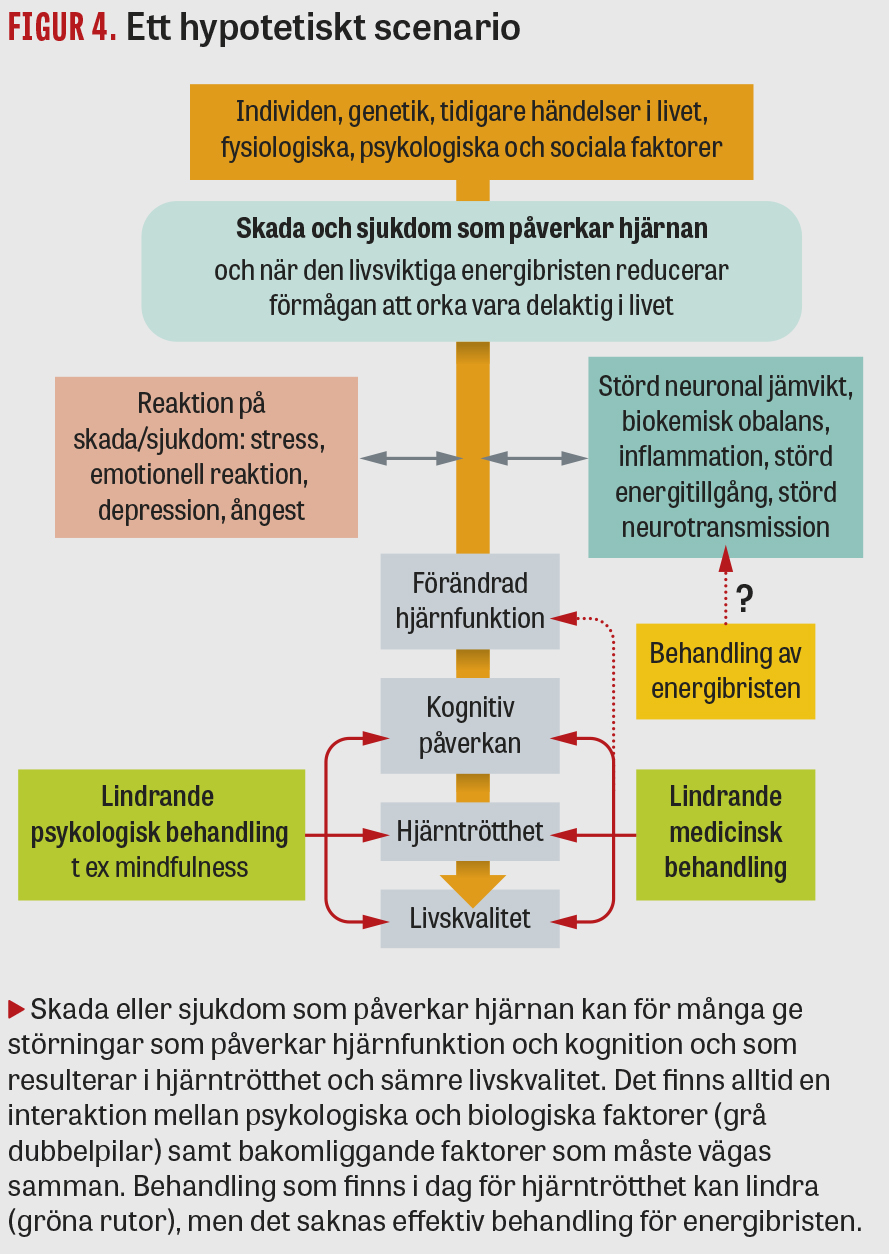 I dag saknas förklaring till att hjärntrötthet kan bli långvarig. Eftersom hjärnskadans omfattning och lokalisation och personens ålder, utbildning eller kön inte verkar ha betydelse för risken att hjärntröttheten blir långvarig, kan man hypotetiskt undra om det finns riskfaktorer, biologiska såväl som psykologiska, redan före insjuknandet eller skadan [32, 33] (Figur 4).