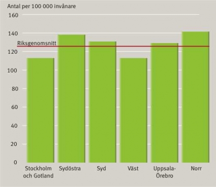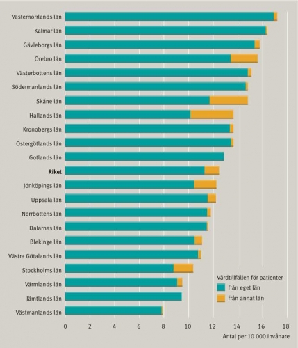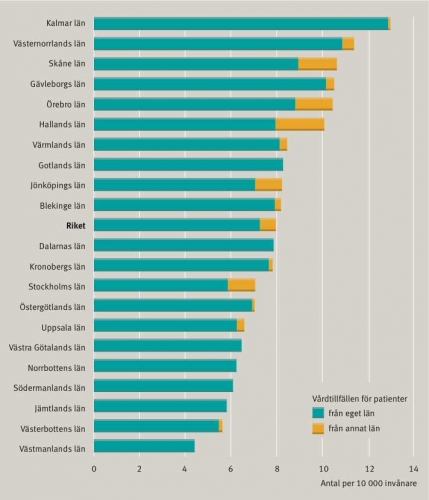 I Sverige varierar frekvensen av utförda höftprotesoperationer regionalt (Figur 1). Denna snedfördelning har noterats sedan mer än tio år tillbaka i tiden. Betraktar man frekvensen länsvis blir skillnaderna ännu större. Trots justering för ålder och kön utförs dubbelt så många höftprotesoperationer och fyra gånger fler knäprotesoperationer i det län som uppvisar högst jämfört med det län som har lägst frekvens (Figur 2 och Figur 3).