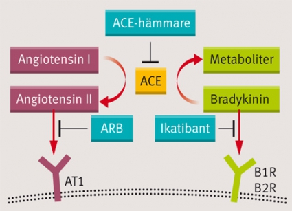 ACE-hämmare är läkemedel som påverkar renin–angiotensinsystemet (RAS) genom att hämma aktiviteten hos angiotensinkonverterande enzym (ACE), ett endotelbundet enzym som konverterar angiotensin I till den potenta vasokonstriktorn angiotensin II. ACE bryter också ned peptidhormonet bradykinin till dess inaktiva metaboliter. Bradykinin aktiverar bradykininreceptorer (B1R och B2R). Aktivering av B1R resulterar i ökad endotelpermeabilitet och ökat utträde av vätska och plasmaproteiner, vilket orsakar ödemet. Aktivering av B2R resulterar i kraftig vasodilatation genom relaxation av glatta muskelceller i kärlväggen. Figur 2 visar effekten av ACE-hämmare, ARB och B2R-antagonisten ikatibant. Bradykinin bryts ned också av flera andra enzymer.