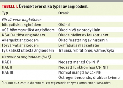 Angioödem indelas i hereditära och förvärvade former (Tabell I). Förekomsten av hereditära angioödem i befolkningen uppskattas till <2/100 000 invånare [3]. Incidensen av angioödem utlösta av läkemedel som påverkar renin–angiotensinsystemet är ännu okänd. Speciellt för angioödem utlöst av ACE-hämmare är att det kan uppstå när som helst under behandlingen. Vanligen ses det inom den första månaden, men det finns många rapporter om debut åratal efter behandlingsstart [4-6].