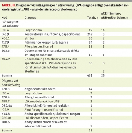 Studien är godkänd av etikprövningsnämnden i Lund, och patienterna har lämnat samtycke. Endast patienter som vårdats på intensivvårdsavdelningen i Lund för högt luftvägshinder utlöst av ACE-hämmare eller ARB har inkluderats. Patientmaterialet identifierades retrospektivt genom sökning bland relevanta primära IVA-diagnoser [9] (Tabell II). Angioödem finns inte som primär IVA-diagnos utan andra diagnoser fick användas för att hitta patientmaterialet. Två fall som var kända för oss, men där primär IVA-diagnos inte kunde återfinnas, inkluderades också. Sökningen omfattade tidsperioden 1 januari 2005 till och med 10 oktober 2010. Totalt 431 IVA-journaler granskades.