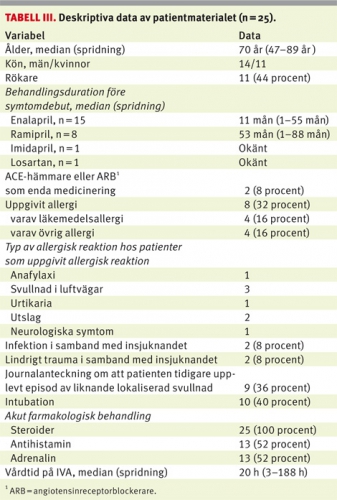 Beskrivning av patientmaterialet presenteras i Tabell III. Könsfördelningen var jämn. Behandlingstid fram till det aktuella vårdtillfället var, för hela materialet, i genomsnitt 14 månader. Totalt 11 patienter (44 procent) var rökare, lika många var icke-rökare; uppgift saknades hos 3 patienter. Allergi mot minst ett läkemedel uppgavs av 4 patienter (2 lidokain, ciprofloxacin, penicillin, NSAID, venlafaxin), övriga allergier hos ytterligare 4 (2 getingstick, ägg, damm). Ingen patient uppgav allergi av båda slagen. Hos 2 patienter fanns en aktuell infektion (faryngit, pneumoni), och hos ytterligare 2 individer uppgavs ett lokalt mindre trauma (tungbett, getingstick) ha varit bidragande orsak till svullnaden. I journalanteckningarna noterades att 9 patienter berättat om tidigare episoder av liknande, lokaliserad svullnad. Intubation krävdes i 10 fall, lika många män som kvinnor.