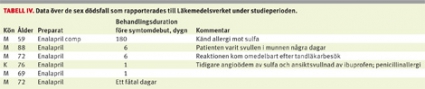 Fallbeskrivningar tyder på att ACE-hämmare verkar kunna potentiera den inflammatoriska effekten av lokala trauman [19, 20]. I vår studie uppgav två patienter »mikrotrauma« i nära anslutning till symtomdebut: getingstick respektive tungbett. Det är också välkänt att angioödem kan utlösas av mindre trauman i munhåla och svalg hos patienter med hereditärt angioödem [21], t ex vid tandläkarbesök. Ett av dödsfallen (Tabell IV) inträffade i samband med tandläkarbesök [22].