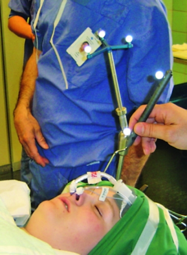 Vid operationstillfället applicerades den prefabricerade bettskenan. Patientens huvud fixerades i ett Mayfieldstöd vid vilket referensstjärnan var fäst. En sladdlös laserskanner, Z-touch (Brainlab, Tyskland), användes för att först göra en registrering av väldefinierade anatomiska strukturer utan bruk av markörerna i bettskenan. Noggrannheten i denna registrering kontrollerades sedan med en ny registrering med hjälp av markörer i skenan. Båda registreringarna visade en noggrannhet på mindre än 0,5 mm. Även längden på sågblad och osteotomer kalibrerades med navigationssystemet så att man under operationen kunde följa instrumentens positioner på dataskärmen (Figur 5).