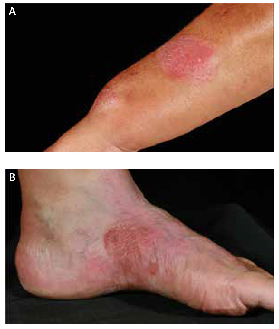 Mycosis fungoides beskrevs första gången 1806, och namnet betyder »svampliknande«, då hudutslagen kan likna en svampinfektion. Mycosis fungoides drabbar ofta medelålders eller äldre personer, men kan även förekomma hos yngre vuxna och barn. I begränsade stadier av mycosis fungoides ses ofta helt släta, lätt fjällande rodnader i huden, så kallade »patches«, eller infiltrerade, upphöjda, rodnade, fjällande »plack« (Figur 1A–B). Utslagen sitter vanligen på bål och glutéer, men de kan uppstå var som helst i huden. I mer avancerade stadier av mycosis fungoides kan patienten utveckla upphöjda tumörer (Figur 1C) eller en generell hudrodnad, så kallad erytrodermi. Lymfomet kan också engagera lymfkörtlar eller andra organ.