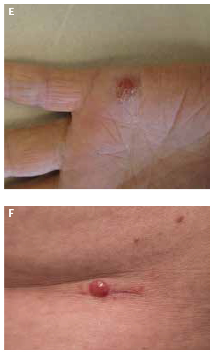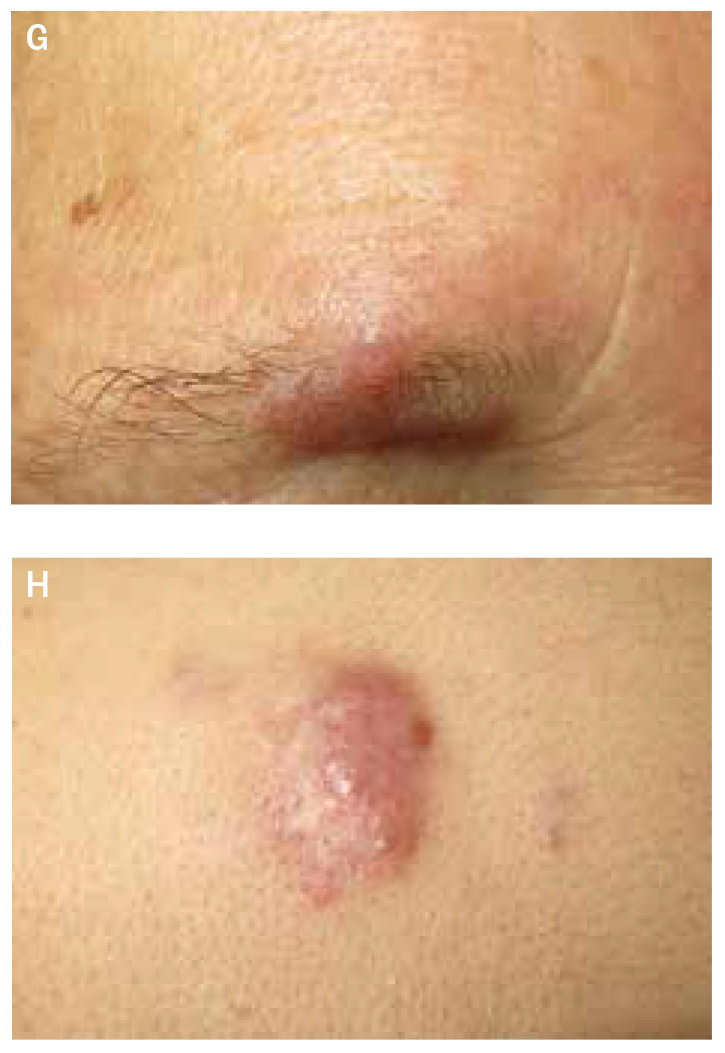 Figur 1. Typiska kliniska manifestationer av hudlymfom. Mycosis fungoides som »patch« (A), plack (B) och tumör (C) med omkringliggande »patches« och plack. Sézarys syndrom (D), lymfomatoid papulos (E), primärt kutant anaplastiskt storcelligt lymfom (F), primärt kutant marginalzonslymfom (G) och primärt kutant follikelcenterlymfom (H).