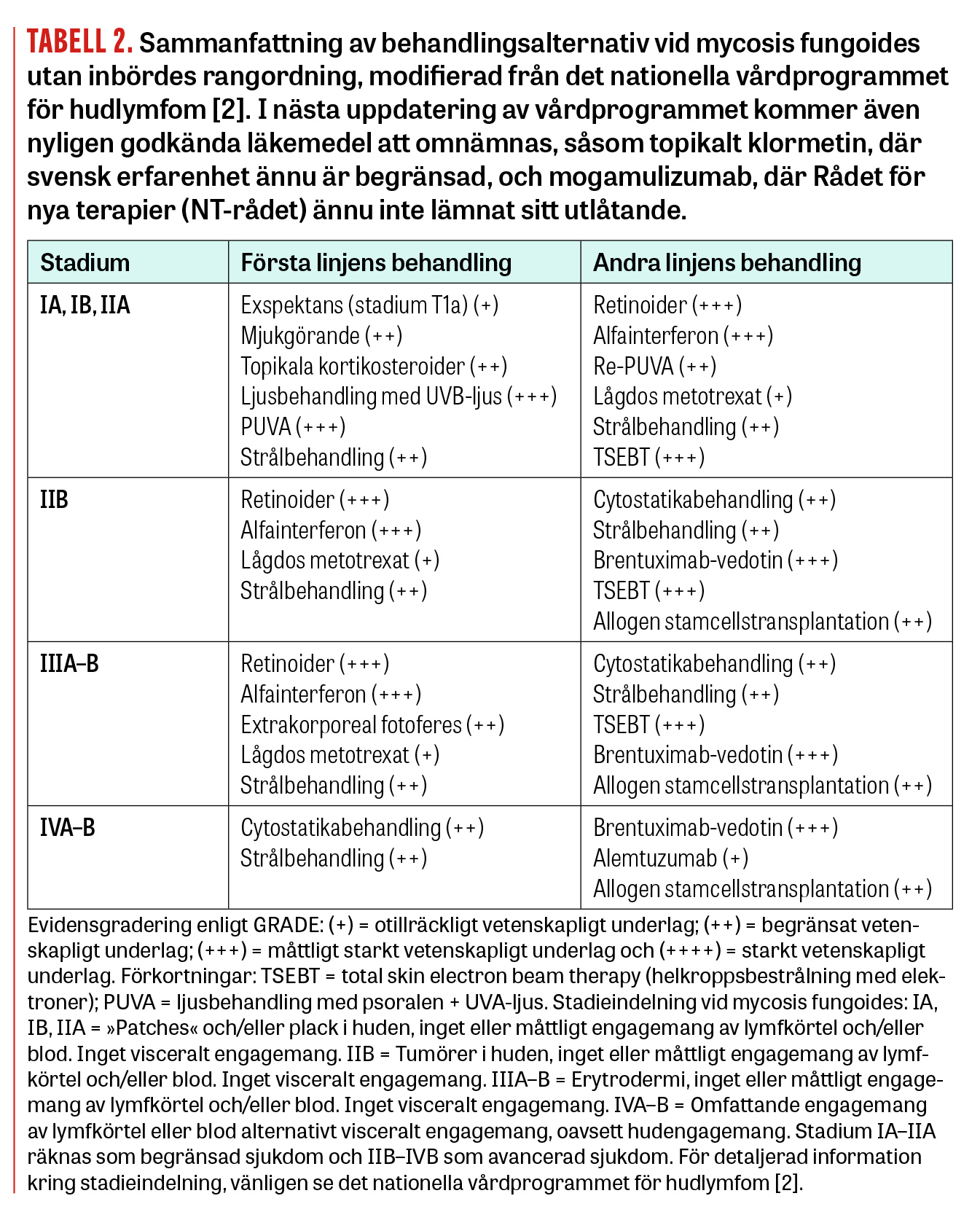 I mer avancerade stadier kan systembehandling med till exempel lågdos metotrexat, retinoider, alfainterferon eller cytostatika ges. Hudlymfom är mycket strålkänsliga, och lokal strålbehandling kan ges i alla stadier av mycosis fungoides.