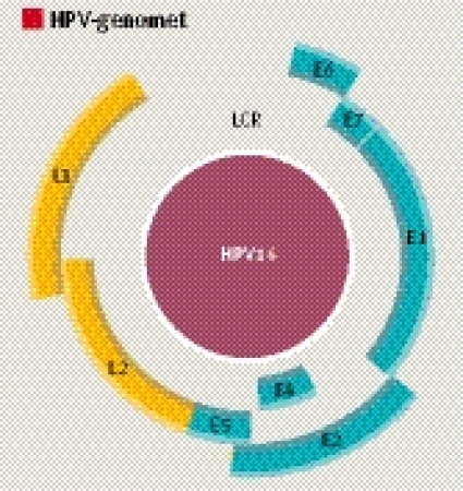 Genomet delas funktionellt i tre delar, den tidiga, den sena och den långa kontrollregionen (Figur 1). Den tidiga regionens gener E1, E2, E4–E7 är viktiga för HPVs patogenes och transformerande förmåga, och hos onkogena HPV klassas E6 och E7 som onkgener. E6 binder det cellulära proteinet p53 och E7 binder det cellulära proteinet pRB och samverkar till att förhindra cellens reglering av cellcykeln, vilket bidrar till tumörutvecklingen.