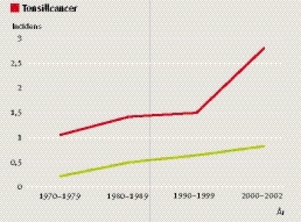 Redan 1995 rapporterade Frisch och medarbetare att tonsillcancerincidensen hos män hade ökat i USA [15]. Samma observation gjordes i Finland [16]. Vi har nyligen undersökt incidensen av tonsillcancer i Stockholmsregionen [17] och i Sverige [opublicerat]. I likhet med det som rapporterats i USA och Finland kunde vi påvisa en 2,9-faldig (2,6 hos män och 3,5 hos kvinnor) ökning av tonsillcancerincidensen i Stockholmsområdet under perioden 1970–2002 (Figur 3).