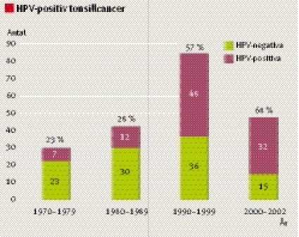 Under den aktuella perioden var således totalt 99/203 (49 procent) av proven HPV-positiva och majoriteten (87 procent ) HPV 16-positiva. Under samma period (1970–2002) som den signifikanta incidensökningen av tonsillcancer noterades uppmärksammades även en signifikant ökning (2,9 gånger, P0,001) av antalet HPV-positiva tonsillcancerfall. Fördelningen av HPV-positiva fall var 7/30 (23,3 procent ) på 1970-talet, 12/42 (29 procent) på 1980-talet, 48/84 (57 procent) på 1990-talet och 32/47 (68 procent) åren 2000–2002 (Figur 4).