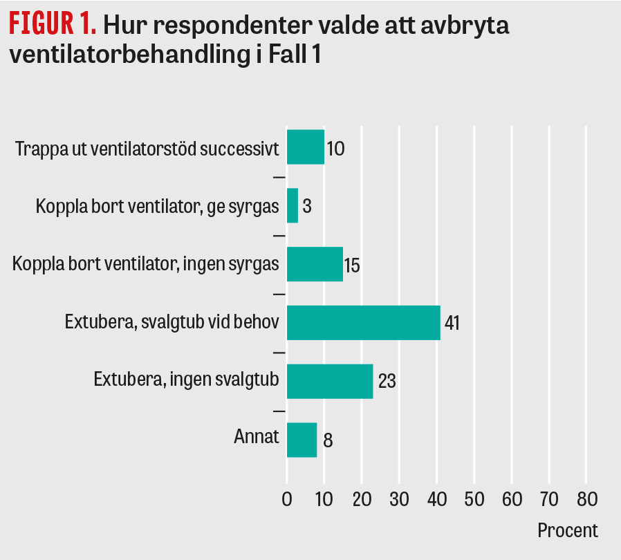 Störst variation fanns kring beslut om hur man skulle avbryta ventilatorbehandling. 10 procent i Fall 1 och 24 procent i Fall 2 skulle trappa ut ventilatorbehandling och därmed förlänga döendet, kanske för att undvika känslan att det var själva extubationen som orsakade patientens död. Av de som skulle extubera var det 44 procent som skulle använda en svalgtub om patienten inte kunde hålla fri luftväg – en behandling som förlänger döendet, men som vissa läkare kanske ser som palliativt.