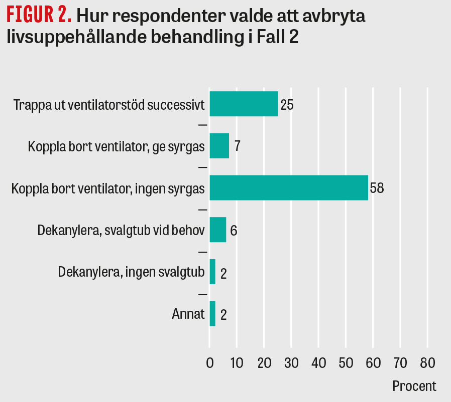 25 procent av läkarna skulle trappa ut ventilatorbehandlingen över tid, 58 procent skulle koppla bort ventilator och låta patienten andas rumsluft. 8 procent skulle dekanylera patienten. 3 procent valde en kombination av nedtrappning av ventilatorstöd och sedan bortkoppling av ventilatorn när patienten hade blivit medvetslös (Figur 2).