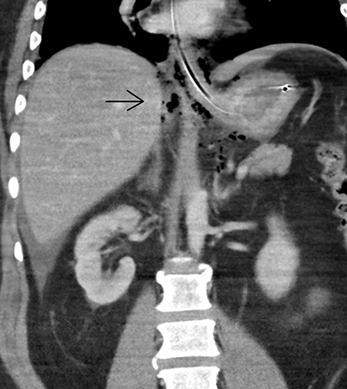 Ventrikel- eller tarmperforation, strangulationsileus eller pankreatit var de differentialdiagnoser som låg närmast till hands. Omedelbar laparotomi övervägdes, men då tillståndet stabiliserades något valde vi, efter diskussion med inringd radiolog, att först utföra datortomografi av buken. Omedelbar tolkning av radiolog gav direkt muntligt besked om smärre mängder fri gas samt spridd gas retroperitonealt bakom pankreas och intill mesenterialroten (Figur 1). I första hand förelåg misstanke om perforerat ulcus duodeni, men bilden bedömdes även kunna stämma med en perforation i gastroesofageala övergången.