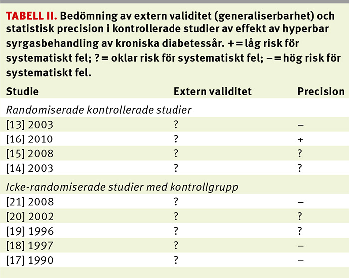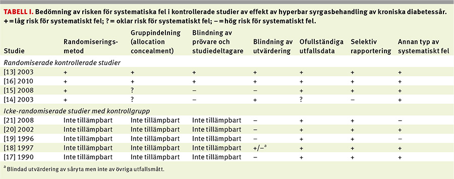 Utöver kontrollerade studier användes även fallserier, men då endast för att redovisa komplikationer. Det gjordes även en analys av kostnaden för att behandla kroniska diabetesfotsår med hyperbar syrgasbehandling.