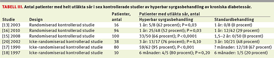 Det bör noteras att i de två randomiserade studierna ovan hade patienterna haft sina diabetesfotsår betydligt längre än 4 veckor innan de inkluderades i respektive studie, i medeltal ca 6–10 månader [13, 16] (Tabell III).