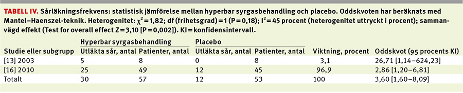 Samtliga studier visade en ökad andel utläkta sår bland dem som fått hyperbar syrgasbehandling (Figur 1 och 2). Ungefär två av tre sår läkte fullständigt. Detta motsvarar en nästan dubbelt så hög utläkningsfrekvens jämfört med standardbehandling (Tabell III). En metaanalys av de två randomiserade studier som hade låg risk för systematiskt fel (Tabell I) gav en oddskvot på 3,60 (95 procents konfidensintervall 1,60–8,09)(Tabell IV).