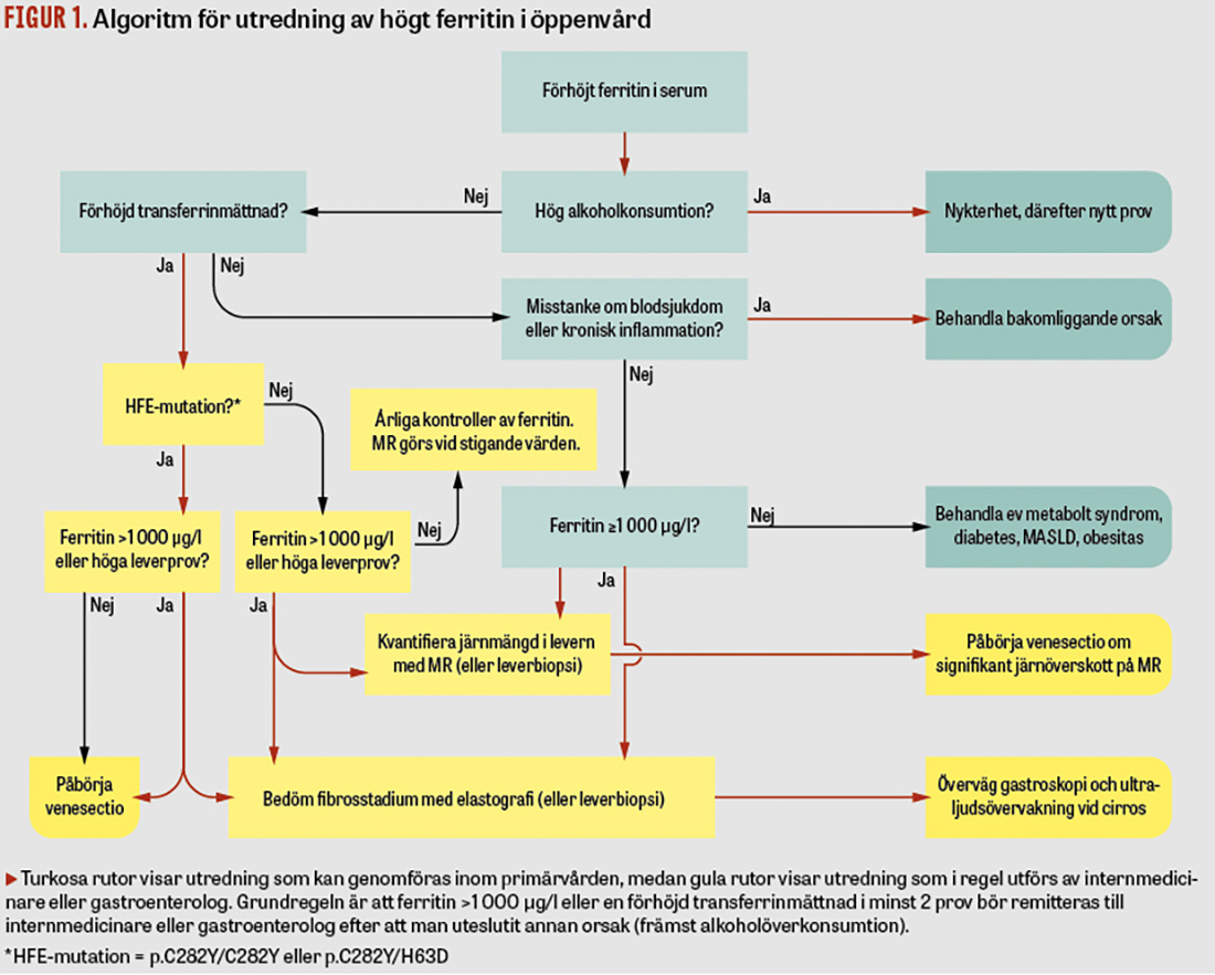 Olika algoritmer för utredning av högt ferritin har presenterats tidigare [44]. Vi föreslår här en algoritm för utredning av hyperferritinemi i öppenvård anpassad efter svenska förhållanden (se Figur 1).