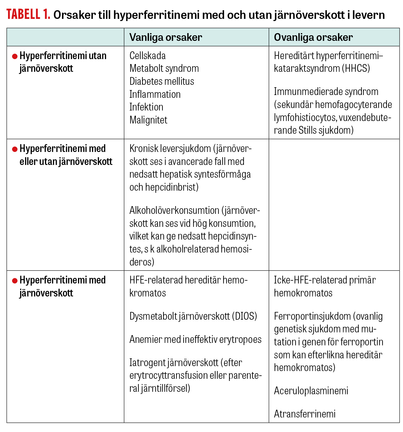 Markant förhöjt ferritin (>10 000 μg/l) bör föranleda övervägande av sällsynta tillstånd som hemofagocyterande lymfohistiocytos, vuxendebuterad Stills sjukdom [7] eller andra akuta tillstånd vid njursjukdom, leversjukdom, infektion eller malignitet [8]. I öppenvård ses vanligen en måttlig ferritinstegring (500–1 500 μg/l), som i de flesta fall orsakas av alkoholöverkonsumtion, kronisk inflammation eller metabolt syndrom. Vid hög transferrinmättnad bör man misstänka hereditär hemokromatos. Olika former av järnöverskott är orsak till högt ferritin i högst 10 procent av fallen; resten har annan genes. De vanligaste orsakerna till högt ferritin listas i Tabell 1.