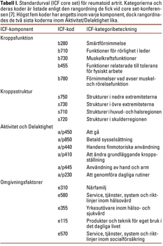 Tabell I visar de fem högst rankade kategorierna för varje komponent vid reumatoid artrit [7]. För kroppsfunktion diskuterades även att ha med b4552 trötthet och b7800 stelhet. För aktivitet och delaktighet var de femte och sjätte kategorierna i tabellen angivna som likvärda. Det saknas dock förslag till kategorier inom ADL-aktiviteter, såsom a530 Att sköta toalettbehov och a540 Att klä sig. Endast den mer ospecifika kategorin Att genomföra dagliga rutiner hade använts i det internationella förslaget. Koderna a440 och a445 gäller primära rörelseaktiviteter och inte sammansatta aktiviteter som i ADL. Kanhända beror detta på sammansättningen av expertgruppen, där dessa aspekter inte hade beaktats. Vidare saknades bland Omgivningsfaktorer e1101 Läkemedel.