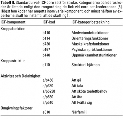 För att ge exempel på några standardurval redovisas i Tabell I–II förslagen till urval av kategorier för två av de patientgrupper där någon av författarna medverkat vid konferenserna. Endast de kategorier där minst hälften av deltagarna instämde (stroke) respektive de fem högst rankade i varje komponent (reumatoid artrit) har medtagits i tabellerna. Notera att man använt endast tre siffror, alltså inte den fjärde möjligheten till vidare kategorisering.