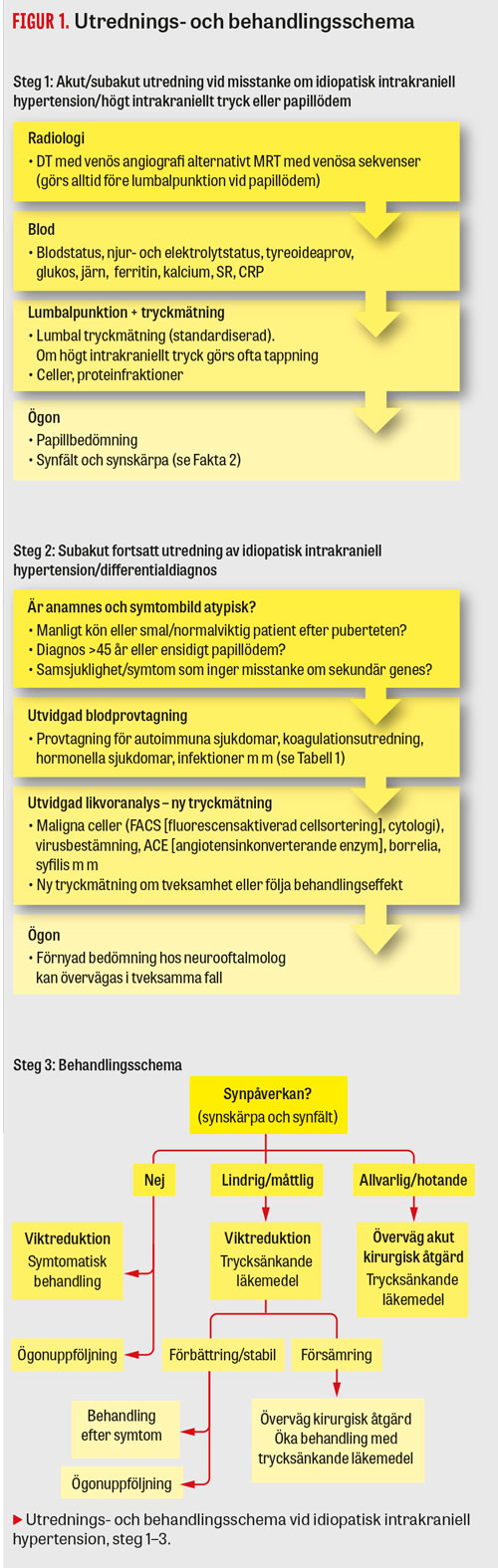 Vid ett multidisciplinärt nationellt möte om idiopatisk intrakraniell hypertension, anordnat av Karolinska universitetssjukhuset i januari 2018, utarbetades underlag till ett nationellt handläggningsstöd för utredning, behandling och uppföljning. Närvarande vid mötet var neurologer, ögonläkare, barnläkare, neurokirurger, neuroradiologer (neurointervention), överviktsspecialister och specialistsjuksköterskor. Vi sammanfattar här resultatet av dessa diskussioner och dagens kunskapsläge.