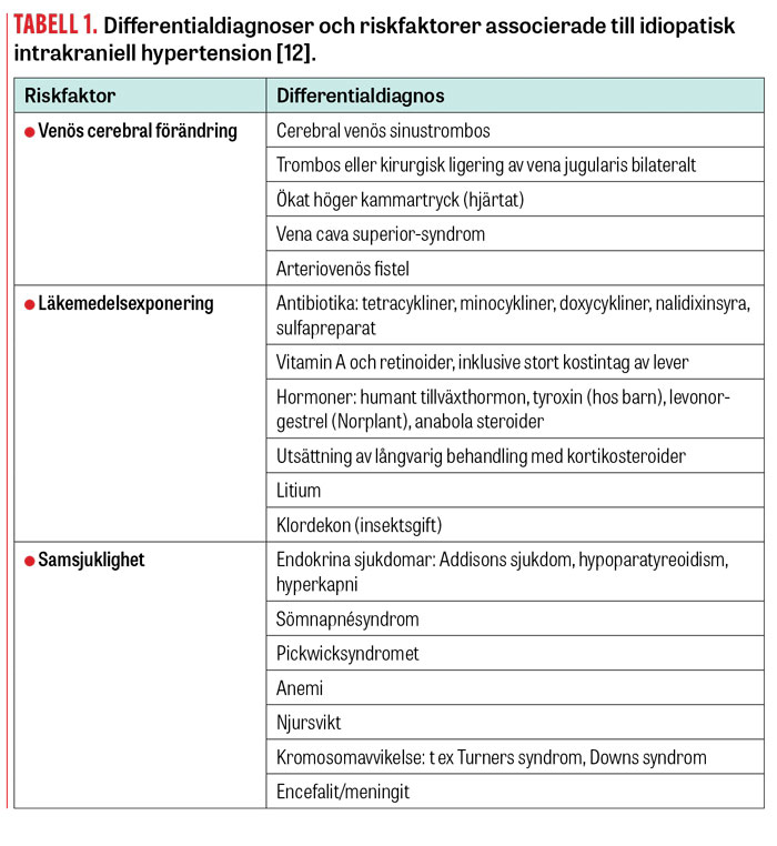 För diagnosen idiopatisk intrakraniell hypertension krävs att annan bakomliggande orsak till högt intrakraniellt tryck har uteslutits. Vi rekommenderar att de i dag kliniskt använda och etablerade diagnoskriterierna, s k modifierade Dandy-kriterier [11], fortsatt används vid diagnostisering (Fakta 1), eftersom de är enkla och lätta att följa i klinisk praxis.