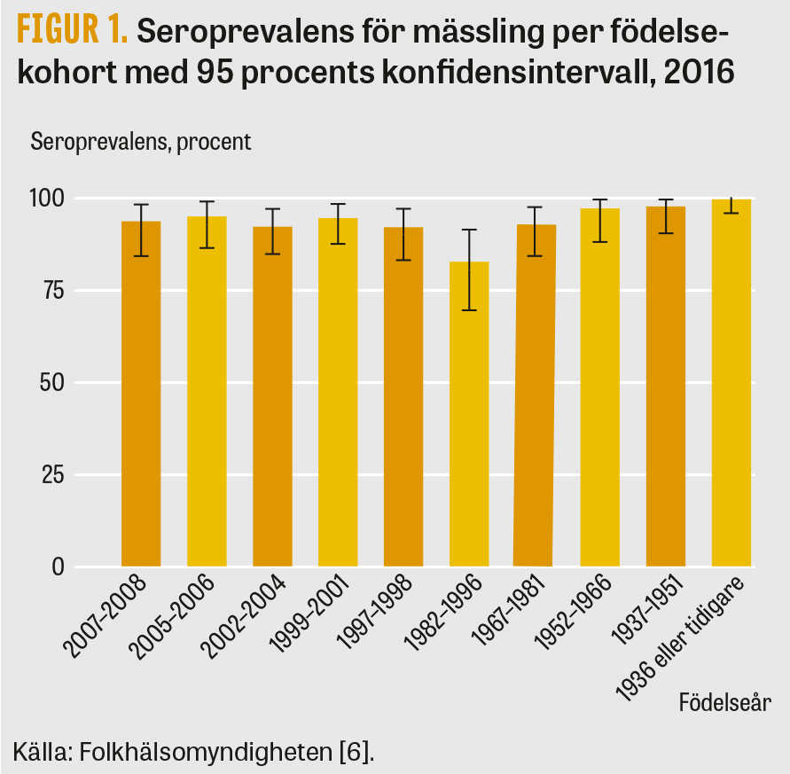 Material till en ny studie samlades in av Folkhälsomyndigheten under 2016, då man använde sig av överblivna prov från öppenvården som samlats in vid laboratorier för klinisk kemi. På grund av covidpandemin försenades analyserna, och rapporten publicerades inte förrän 2025 [6]. Liksom i tidigare undersökningar sågs en hög immunitet mot mässling i befolkningen med en övergripande seroprevalens på 93 procent. Högst seroprevalens och antikroppsnivåer hade de äldre åldersgrupperna, där de flesta sannolikt haft mässling, medan yngre åldrar som omfattats av vaccinationsprogram hade lägre. Lägst seroprevalens (83 procent; 95 procents konfidensintervall 70–92 procent) sågs bland personer födda 1982–1996. Denna grupp inkluderade de äldsta individerna som vaccinerats med två doser MPR-vaccin sedan det infördes i barnvaccinationsprogrammet 1982. Eftersom antalet personer i åldersgruppen var relativt litet (knappt 100 individer), åldersspannet brett och konfidensintervallen vida, måste dock denna lägre seroprevalens tolkas med försiktighet. Dessutom gjordes inte något slumpmässigt urval av prov, vilket innebär att proven inte nödvändigtvis är representativa för befolkningen (Figur 1).