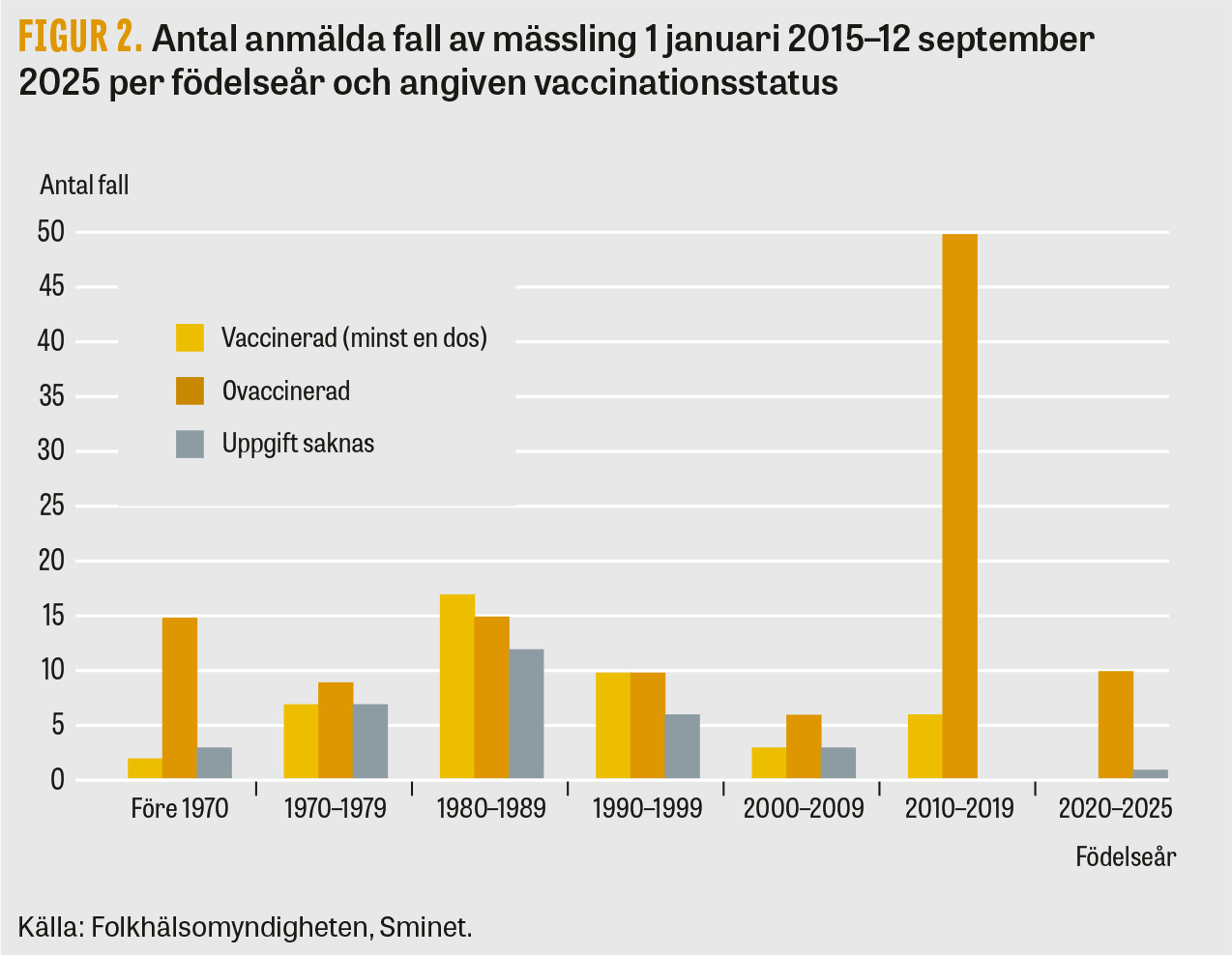 Den kliniska betydelsen av den lägre seroprevalensen är oklar. Att antikroppsnivåer sjunkit med åren hos enskilda individer som vaccinerats med två doser enligt det svenska programmet behöver inte betyda att dessa saknar skydd mot mässling. Liksom en naturlig mässlingsinfektion ger vaccination mot mässling också upphov till ett cellmedierat immunsvar av betydelse för immuniteten [7]. Det faktum att antalet mässlingsfall över lag är litet och inte ökar över tid talar för att immuniteten är fortsatt god [8]. Samtidigt är andelen misstänkta genombrottsinfektioner (infektioner hos vaccinerade individer) högst bland personer födda på 1980-talet, det vill säga de första födelsekohorter där en majoritet förväntas ha vaccininducerad immunitet (Figur 2). Vaccinationsstatus är dock okänd för nästan en tredjedel av fallen i åldersgruppen, varför andelen kan vara både högre och lägre. Det kan förhålla sig så att med tiden sjunkande antikroppsnivåer efter vaccination medför en ökad risk för genombrottsinfektioner, särskilt i samband med intensiv exponering för mässlingsvirus. Liknande mönster har också beskrivits i andra länder med hög vaccinationstäckning som uppnått elimineringsstatus för mässling [9]. En mer intensiv och långvarig kontakt med en högsmittsam person innebär en högre smittdos och ökar sannolikt risken för en genombrottsinfektion. Detta kan ha varit en bidragande orsak till en del av sjukdomsfallen bland exempelvis hushållskontakter och sjukvårdspersonal.
