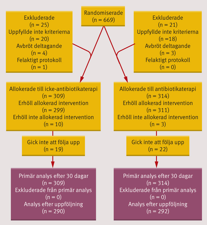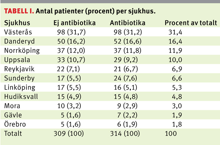 Studien bedrevs mellan oktober 2003 och januari 2010 som en multicenterstudie, där tio sjukhus i Sverige och ett på Island deltog (Tabell I) [16]. Patienter med misstänkt akut divertikulit med feber, buksmärta och förhöjda infektionsparametrar undersöktes med DT av buk och bäcken för att verifiera diagnosen och utesluta komplikationer. Om tillståndet bedömdes som okomplicerad divertikulit randomiserades patienterna till behandling med eller utan antibiotika (Figur 1). Inklusionskriterier och exklusionskriterier framgår av Fakta 1.