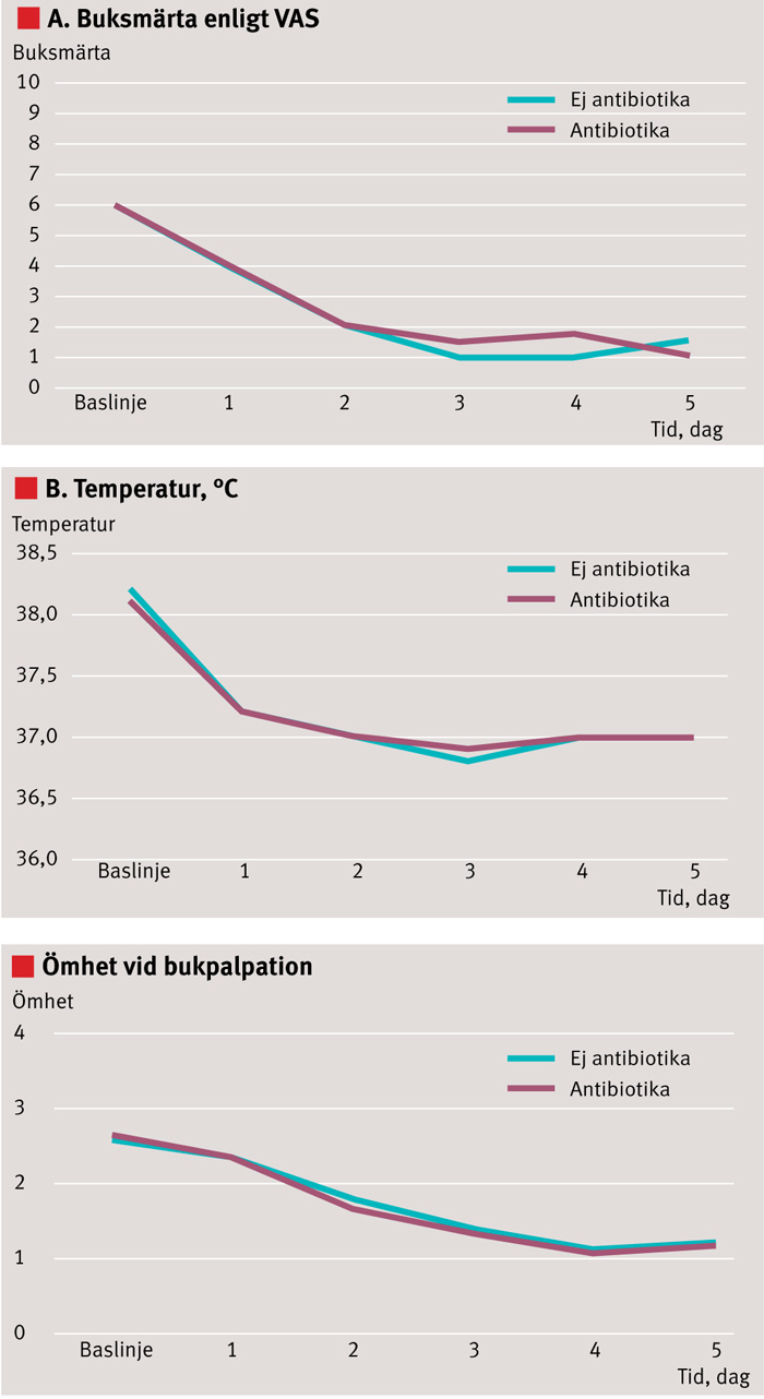 Totalt drabbades nio patienter (1,4 procent) av komplikationer: perforation i sex fall och abscess i tre. Fyra patienter genomgick akut operation och åtta opererades akut eller elektivt under uppföljningstiden. Medianvårdtiden var tre dagar i bägge grupperna (variationsvidd 0–25). Det fanns ingen signifikant skillnad avseende komplikationer, operationer eller vårdtid mellan grupperna (Tabell III). Beträffande patienternas smärtupplevelse, feber och palpationsömhet i buken vid inläggning och under vårdtiden sågs ingen skillnad mellan grupperna (Figur 2).