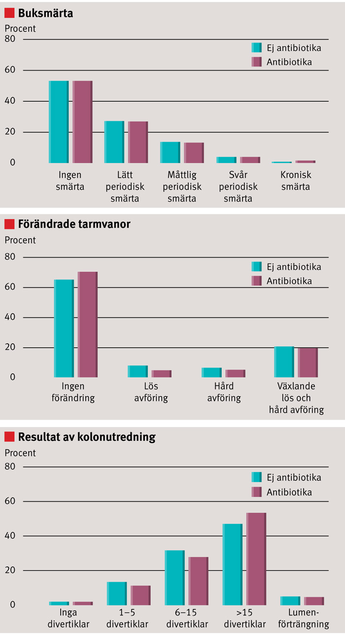 Efter mer än 50 års massiv användning av antibiotika vid divertikulit är detta den första randomiserade studien som försökt utvärdera antibiotikabehandling vid akut okomplicerad divertikulit. Resultatet visar på låg risk för komplikationer med perforation eller abscesser (1,4 procent) utan någon statistisk skillnad mellan patienter behandlad med eller utan antibiotika. Det fanns dessutom ingen skillnad mellan grupperna beträffande operationer, vårdtid, minskning av feber eller buksmärta under vårdtiden eller beträffande recidiv, buksmärta och förändrade avföringsvanor under ett års uppföljningstid.