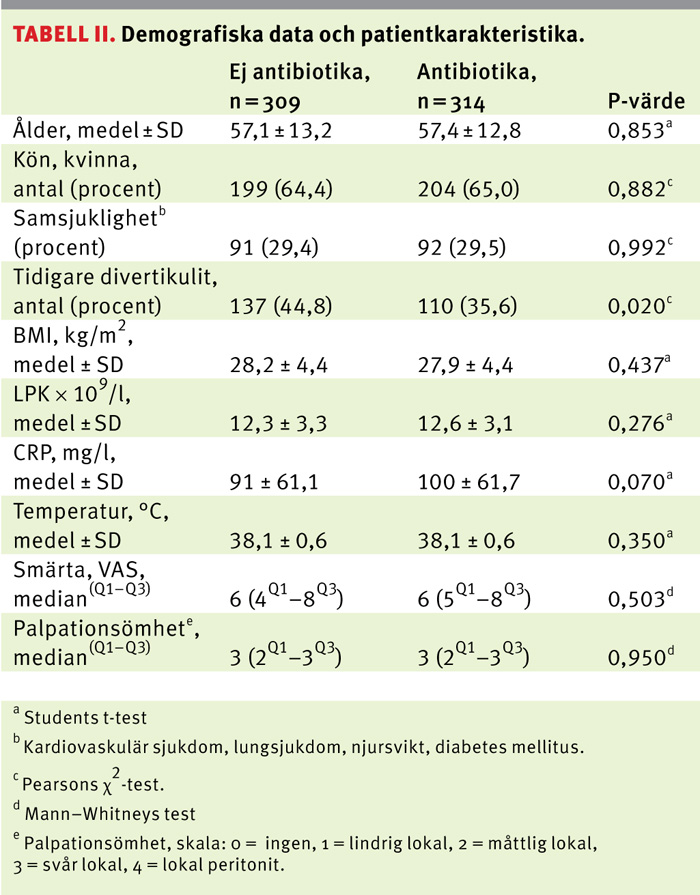 Vid inklusion (alla hade anamnes på buksmärta och feber) hade 97 procent lågtsittande vänstersidig buksmärta och 90 procent en temperatur på ≥38 °C. Förändrade avföringsvanor med diarré eller förstoppning förekom hos 34 procent, medan 8 procent hade symtom från urinvägar. Det fanns inga statistiska skillnader mellan grupperna beträffande dessa symtom. Avseende ålder, kön, samsjuklighet, BMI, LPK, CRP och temperatur var grupperna välbalanserade, likaså för buksmärta enligt VAS och palpabel bukömhet. Tidigare genomgången divertikulit var dock mer frekvent i icke-antibiotikagruppen (P = 0,02) (Tabell II).